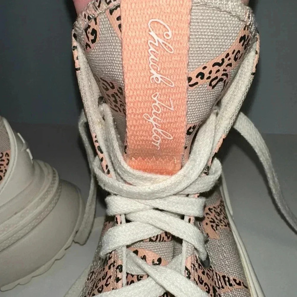 Pre-owned Converse Run Star Hike platform sneakers in women's size 6.5. The beige canvas upper features a pink leopard print. The shoes have a thick, off-white platform sole. The laces are white. The Converse All Star logo is visible on the inner ankle. The shoes show minor signs of wear consistent with pre-owned condition. Approximate dimensions are 11 inches in length, 4 inches in width, and 5 inches in height. Materials include canvas and rubber. Functionality is as expected for a pair of sneakers. No significant imperfections are noted.