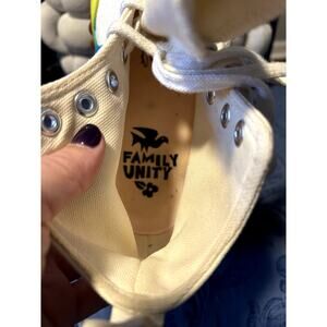 Pride high-tops with full stomp energy. These white Converse sneakers are laced in rainbow, stacked on jagged soles, and wrapped in a gradient midsole that shifts from black to full-spectrum bold. That rainbow star patch? Iconic. It’s giving Y2K skater meets activist chic.