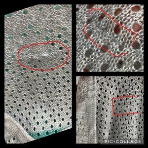 Snag in sweater on front middle below neckline (see Pics #3-7, 12; Pics #3-6, 12 show outside, Pic #7 shows inside).