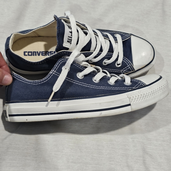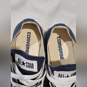 Classic dark blue Converse sneakers. Features white laces and rubber toe cap.