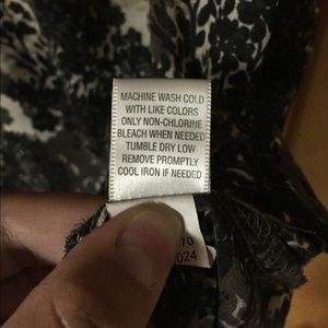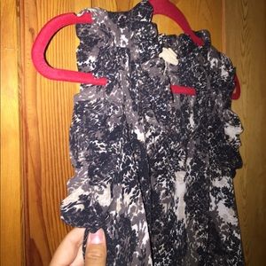 Great condition: gently used, no holes. Detail: beautiful ruffled shoulders and neck line, leafy pattern with black/grey/tan/white. Material: polyester (sheer but NOT see-through). Care: machine wash cold, tumble dry low.