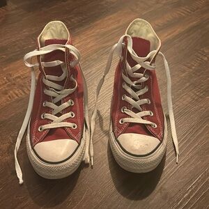 Maroon high-top Converse. Overall in good condition though the shoe laces have minor distress.