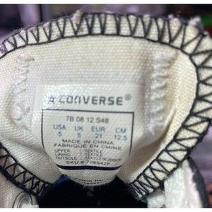 Perfect for all seasons, these shoes are equipped with a lace-up closure and a cap toe. They come in a standard kids US size 5. Suitable for both boys and girls. The shoes also feature the iconic Converse All Star name. Pre-owned with normal wear. See photos.