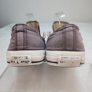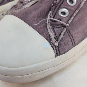 Pre owned purple low top Converse in a laceless slip on design in a mens 13. Destroyed looking fabric part of the original design. Wear shown on white rubbers, paint blotch on one toe top and a few specs can be seen on one of the tongues, wear on insoles, inner heel fabric has been torn and taken off on one shoe, rip on the other. Super grunge punk skater vibes.