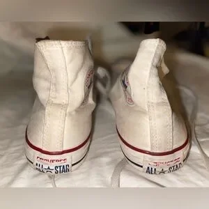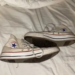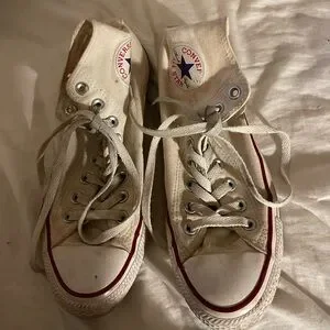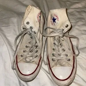 Classic Converse high-tops. Cream canvas with red accents. Iconic star logo.