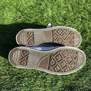Shoes are in good used condition. There are some black marks near the laces on the top and some yellow spots on the back heel.