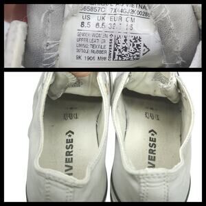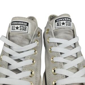 These are a pair of light gray leather low top Converse shoes in a womens 8.5 with gold colored shoe lace eyelets. There is a fair amount of wear, marks on the exterior, the tongue, insoles are worn, some wear on the black rubber line more specifically on the top of one toe area, up close shown in photos, and some wear on the white rubbers themselves. Great if you prefer a more worn in look of your shoes.