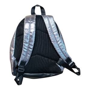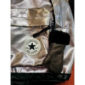 This Converse mini backpack is in good used condition. It features a striking silver metallic finish with black accents, making it a stylish accessory for any outfit.