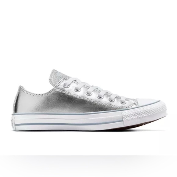 Step out in style with these Converse sneakers, featuring a metallic silver finish that adds a modern twist to the classic low-top design. The shoes boast a durable canvas construction, traditional white laces, and a signature white rubber toe cap, making them a timeless addition to any casual wardrobe.Minor Signs of Wear .There are a few marks but only wore once.According to the website • Runs large, order a half size down
