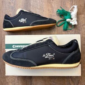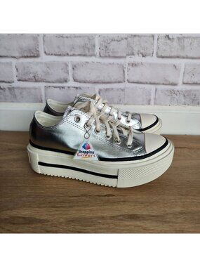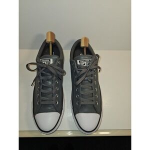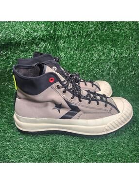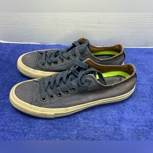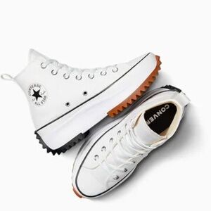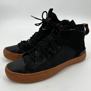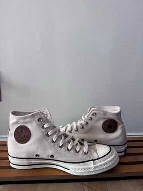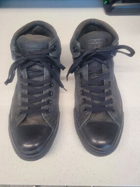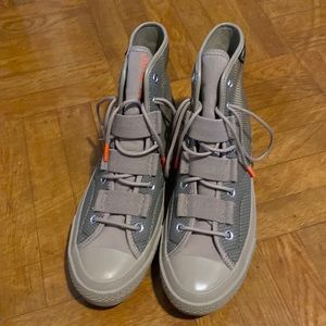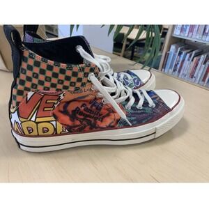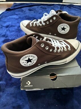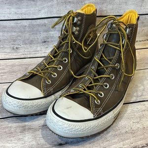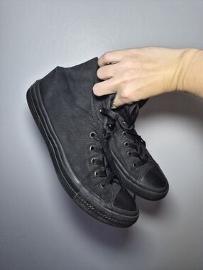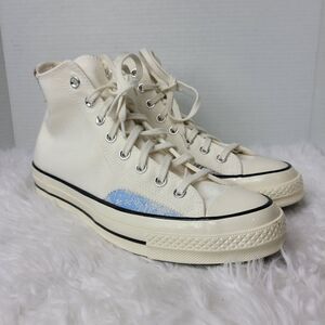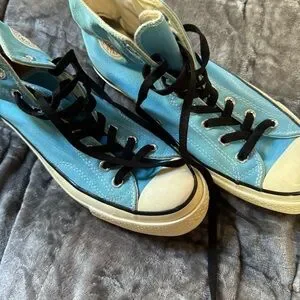 Vibrant sky blue high-tops. Features black laces and iconic logo. Classic Converse style.