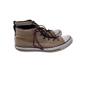 Unisex Converse Chuck Taylor All Star mid-top sneakers in beige and burgundy. Lace-up closure, durable canvas upper, rubber sole. Men’s size 10 (Women's size 12).