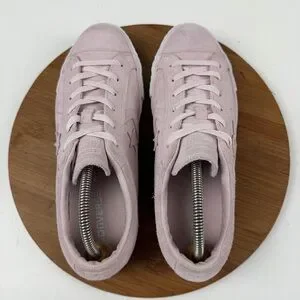 Soft suede upper in pale pink. Low-top silhouette with lace-up closure. Cushioned footbed for everyday wear. White rubber outsole with textured toe cap. Used. Good condition. Normal wear