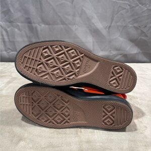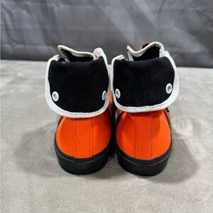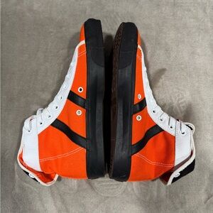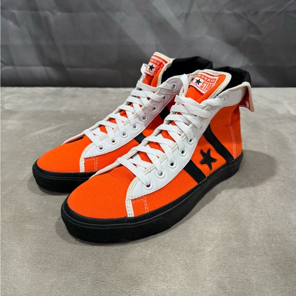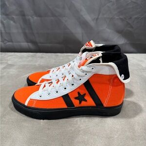 Vibrant orange high-tops with black accents. Iconic Converse style.