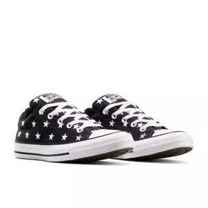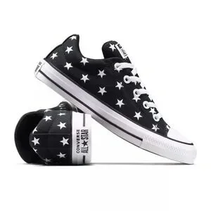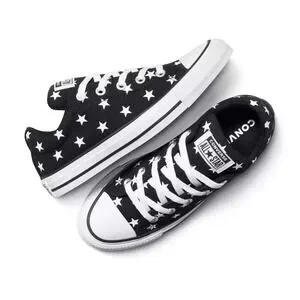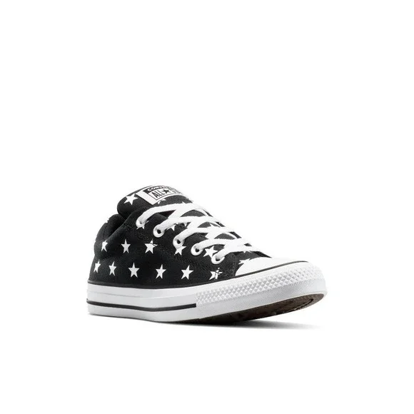 Converse Adult Street Ox Low Sneakers in Black Stars, Men's 5.5 / Women's 7.5, New With Tags. Designed with a classic canvas upper for that iconic Chucks look and feel. Features soft foam cushioning underfoot for comfortable all-day wear and a removable foam footbed for added support. Padded tongue and collar enhance comfort, while fixed laces with elastic bands allow easy on and off. Finished with a flexible 100% rubber outsole and signature All Star license plate detail. Low-top, round closed-toe silhouette with medium width fit. Runs big — size down if between sizes. Keywords: Converse Street Ox sneakers 5.5 7.5, black star low top Chucks, canvas lace up sneakers, unisex Converse shoes, flexible rubber outsole sneakers New With Tags.