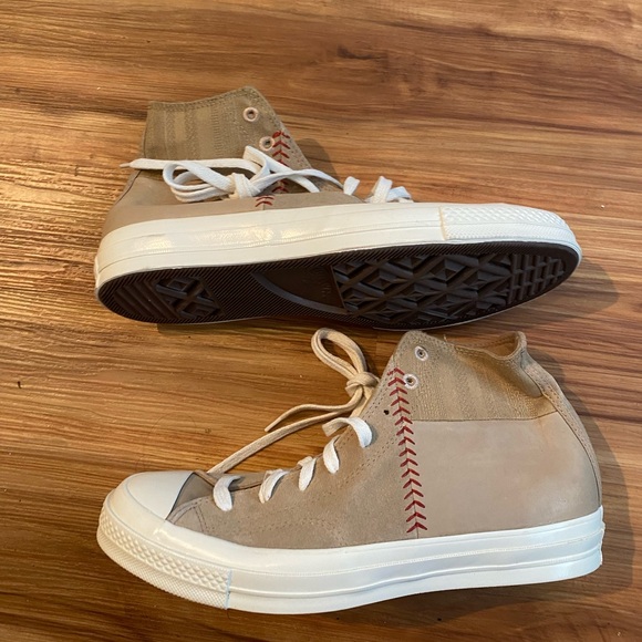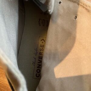 Classic Converse high-tops in tan. Features white accents and durable design. Ideal for everyday style.