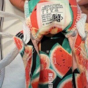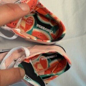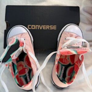 New in Box Converse. Fresh, fun, and ready for summer. These authentic Converse toddler girls sneakers are light pink outside with an adorable watermelon print lining inside. Classic lace-up style for a secure fit. Brand new in box.