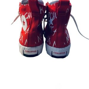 Converse "Not a Chuck" high tops from the UNT1TL3D collection. Featuring a vibrant red canvas upper covered in striking white handwritten-style text, these sneakers flip the script on the classic Chuck Taylor silhouette. A creative and rebellious twist, these limited-edition kicks are perfect for streetwear lovers, Converse collectors, and anyone who wants to stand out.
