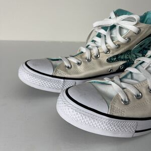 The Converse Chuck Taylor All Star Hi Top in women's size 10 is a stylish and comfortable sneaker with a turquoise butterfly print. Featuring a lace-up closure and a high-top silhouette, these shoes are perfect for casual occasions. Made with breathable blended fabric and a durable rubber outsole, they are ideal for all seasons. This iconic Converse model also includes signature lace and logo accents, embodying the classic CTAS style with a modern twist.