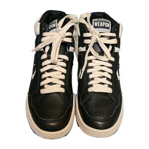 The product is a pair of Converse Weapon Mid White Black A04400C basketball shoes in women's size 8 and men's size 6.5. These sneakers feature a mid-top style with a rubber outsole for traction and durability. The shoes are cushioned and comfortable, suitable for all seasons. The black color with solid pattern and leather upper material gives a classic 90s retro look. Made in Vietnam, these Converse Weapon shoes are part of the Weapon product line, designed for athletic performance, specifically for basketball.