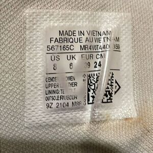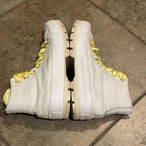 Chuck Taylor All Star Lugged Leather, high top sneaker shoes by Converse in a women's size 8. Style 567165C. Original laces have been replaced with yellow satin laces. Soles show use. Leather uppers could use some white polish. Tears in the lining on the heels of both shoes. shee photos. Removable, cushioned insole. Very comfortable. Some gaps along the top edge of the rubber outsoles and leather uppers which is common with sneakers. I did use shoe glue on some spots but ran out of glue. Overall in good pre-owned condition with signs of wear from normal use.