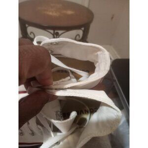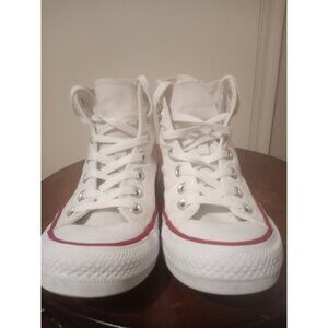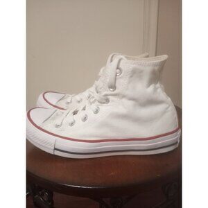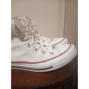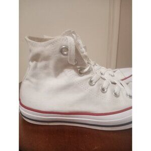 Classic white Converse high-tops. Iconic design with red accents. Perfect for casual wear.