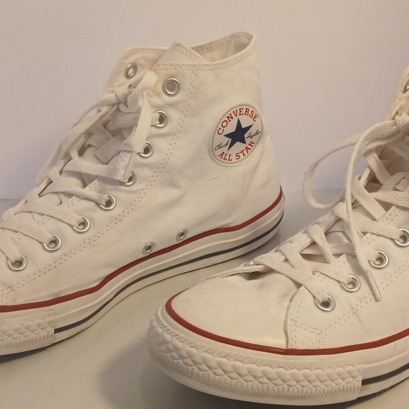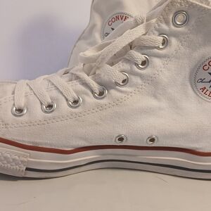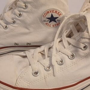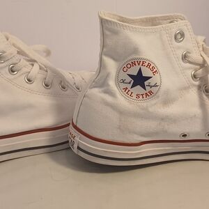 Classic white high-top sneakers with red accents. Iconic Converse logo on the side.