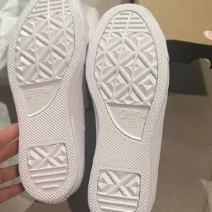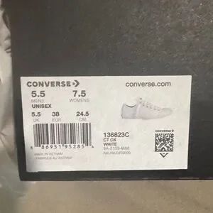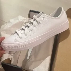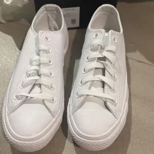 Converse low-top sneakers in white. Smooth leather upper with lace-up front. Classic rubber toe cap and sole. Minimal, versatile design.