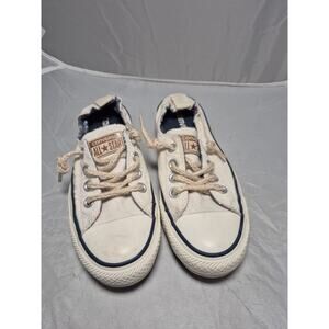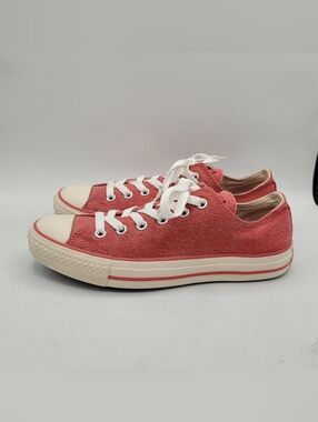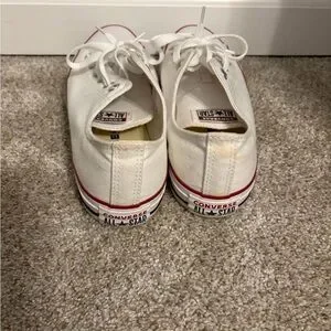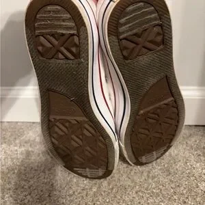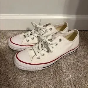 Classic Converse sneakers unisex. White canvas with red trim. Perfect for casual wear. Woman’s 9 men’s 7