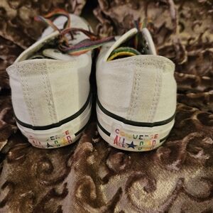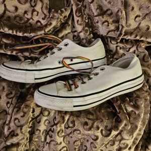 Classic white Converse sneakers featuring vibrant rainbow multicolor tongue and laces. Ideal for a bold style statement! Great condition!