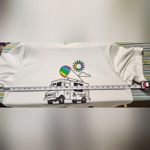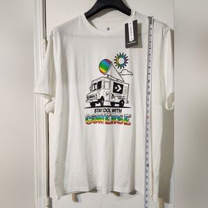 White Converse tee featuring a vibrant graphic. Includes a playful design with a truck and rainbow accents.