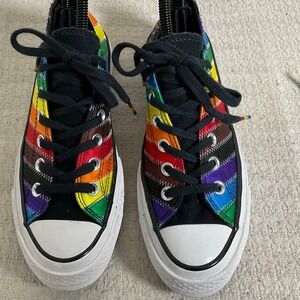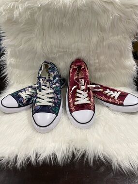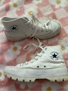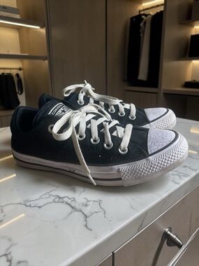 Classic low-top sneakers in white with black accents. Perforated toe and black laces. Star logo visible on the insole and side. Clean, sporty look.
