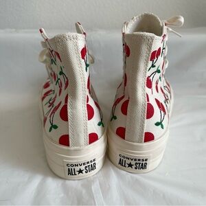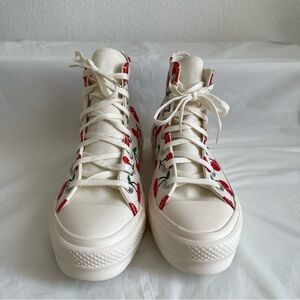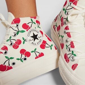 Chic high-top sneakers with cherry design. White canvas with red accents. Ideal for a fun look.