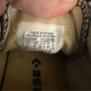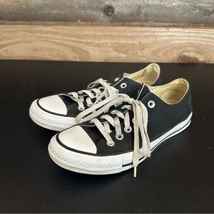 These ladies, black Converse Allstar, Chuck Taylor, low top with a purple second tongue are a size 7, and are in good preowned condition. Please see photos for all imperfections as they are part of the description and show the wear and condition of the shoes. Questions? Leave a comment below!