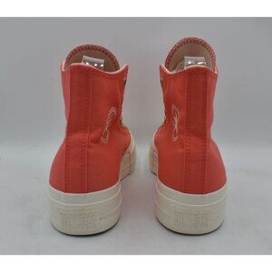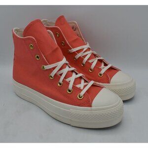 These Converse All-Star sneakers feature a coral canvas upper with platform soles for added height and style. The high-top design offers ankle support, while the durable canvas and rubber sole provide long-lasting wear. Gold eyelets and white laces add a touch of contrast, complementing the vibrant coral shade.
