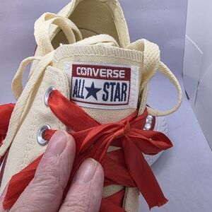 Stylish Converse women's sneakers in cream with vibrant red accents. Perfect for adding a pop of color to any outfit.