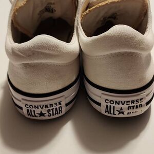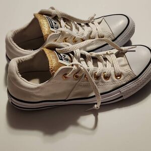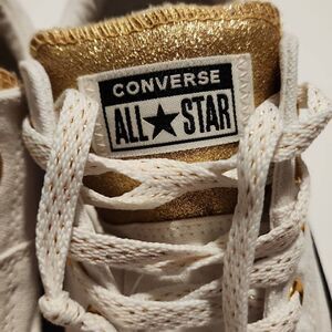 Converse All Stars women's white and glittery gold low tops in great shape, size 8. In shoes are a little stained.