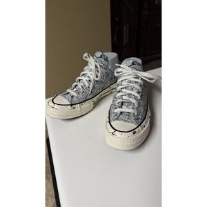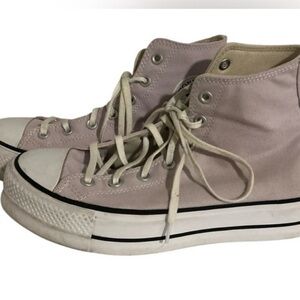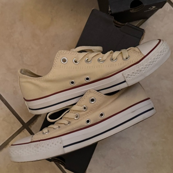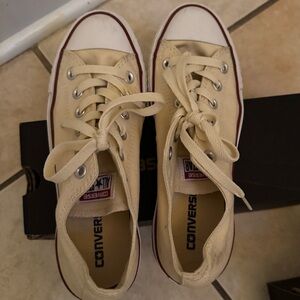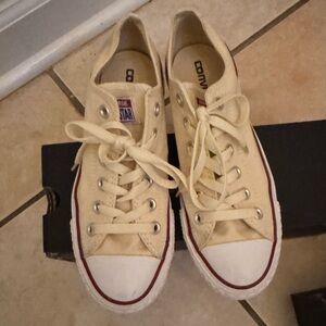 Classic Converse sneakers. Beige color with some wear some black marks on beige parts, Ideal for casual outings. Size 8 women’s. Please let me know if you have any questions.