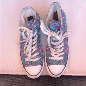 Stylish Converse high-tops with a floral design. Blue base with red and green floral accents. Comfortable and trendy for everyday wear.