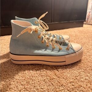 Light blue Converse sneakers with platform sole. Features classic logo and white laces. Perfect for casual style. Never worn, bought the same pair in different color, both the wrong size.