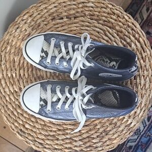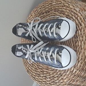 Super trendy metallic blue leather high top sneakers with snakeskin print leather front panel and white soles. Pre-owned and in very gently used condition. Please see pictures.