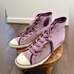 These purple converse high-tops come with gold eyelets and gold laces tips. Perfect for everyday wear. These sneakers are clean and in excellent condition. Shoe inserts are not included.