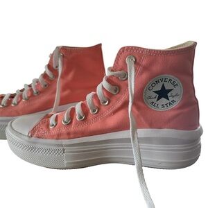 Bold, lightweight, and still classic Chucks - the Converse Unisex Chuck Taylor All Star Move Hi Canvas Material Sneaker - Lace up Closure Style - Flamingo/White/White. With a canvas upper and an iconic Chuck Taylor ankle patch, these lace-up sneakers let you express yourself as they elevate your style profile. The OrthoLite insole and rubber outsole promise comfort while ensuring you never touch the ground. Condition: Good (light wear, clean uppers and soles)