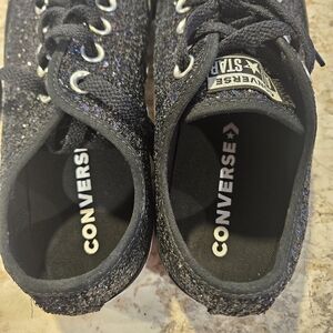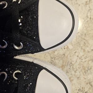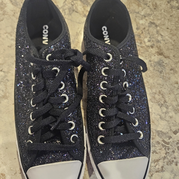 Shimmer with these stylish Converse sneakers. Black glitter finish adds flair. Ideal for everyday wear. Women's 10.5