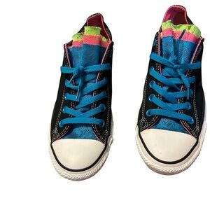 Converse Women’s black with blue, Pink, Green Lace tongue Low Tops Sz 9
