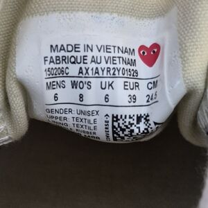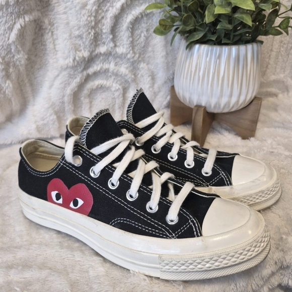 This is a limited edition pair of Converse X Comme Des Garcons Play sneakers in black, featuring a low lace-up design and a canvas fabric type. This sneaker is designed for women in size 8 (UK 6, EU 39) and is suitable for occasions such as activewear, casual wear, and workwear. It has accents like laces and logo details, including the red heart graphic, as well as features like cushioning, comfort, and a rubber outsole suitable for walking and streetwear activities like skateboarding. The sneaker is part of the Converse X Comme Des Garcons Play product line and carries a theme that combines designer streetwear with a colorful heart pattern, making it a stylish choice for those who appreciate unique and limited edition footwear. EXCELLENT USED CONDITION!