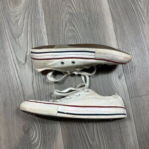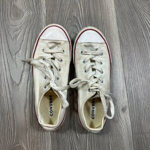Ships fast from North Carolina! Classic Converse youth white low top sneakers, perfect for everyday wear, school, or casual outings. Timeless design pairs with jeans, shorts, and dresses—ideal for back-to-school, summer break, and year-round style. Shows normal signs of wear consistent with use, but plenty of life left.