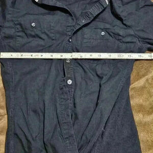 women's small black Coverse button down shirt. this stylish shirt has two pockets. the long sleeve are perfect for the fall weather, but can be rolled up and button in place on warmer days. this shirt is made to be form fitting and comfortable, it has sewn in elastic fabric to bend with you.