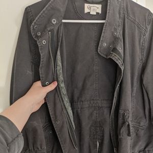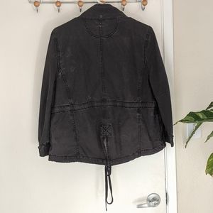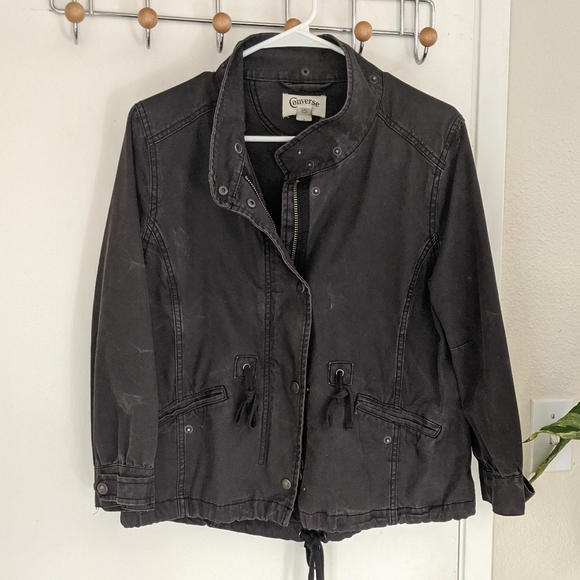 Distressed black/grey jacket from Converse. 100% cotton canvas fabric great for transitional seasons. Closes by zipper and/or buttons. There's a little strip of fabric behind the zipper (on the inside) that shows some wear but otherwise it's in really good shape.