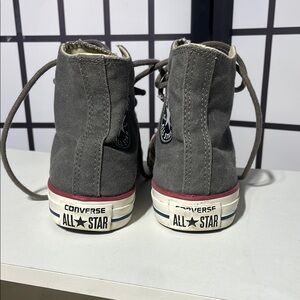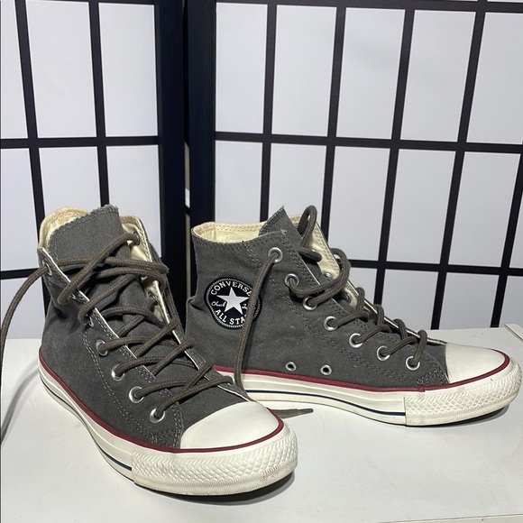 Step into timeless style with these Converse gray high-top sneakers, crafted from durable canvas. these sneakers offer both comfort and a touch of iconic design. Perfect for everyday wear, they effortlessly elevate any casual outfit. Unisex shoe Men’s size 5 womens size 7.
