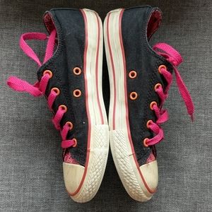 Funky little girls Converse low top shoe. They have been worn but have life left. Black with pink and orange multi tongue shoe. Size 1